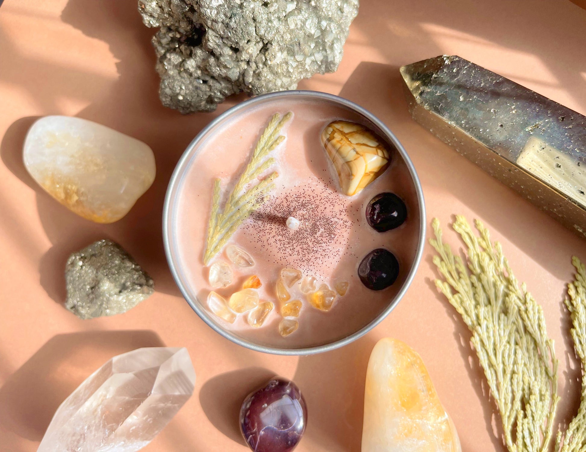 Handcrafted with Organic Soy Wax, infused with Walnut Jasper, Garnet, Citrine & Cedar. Scented with Moroccan Cashmere
