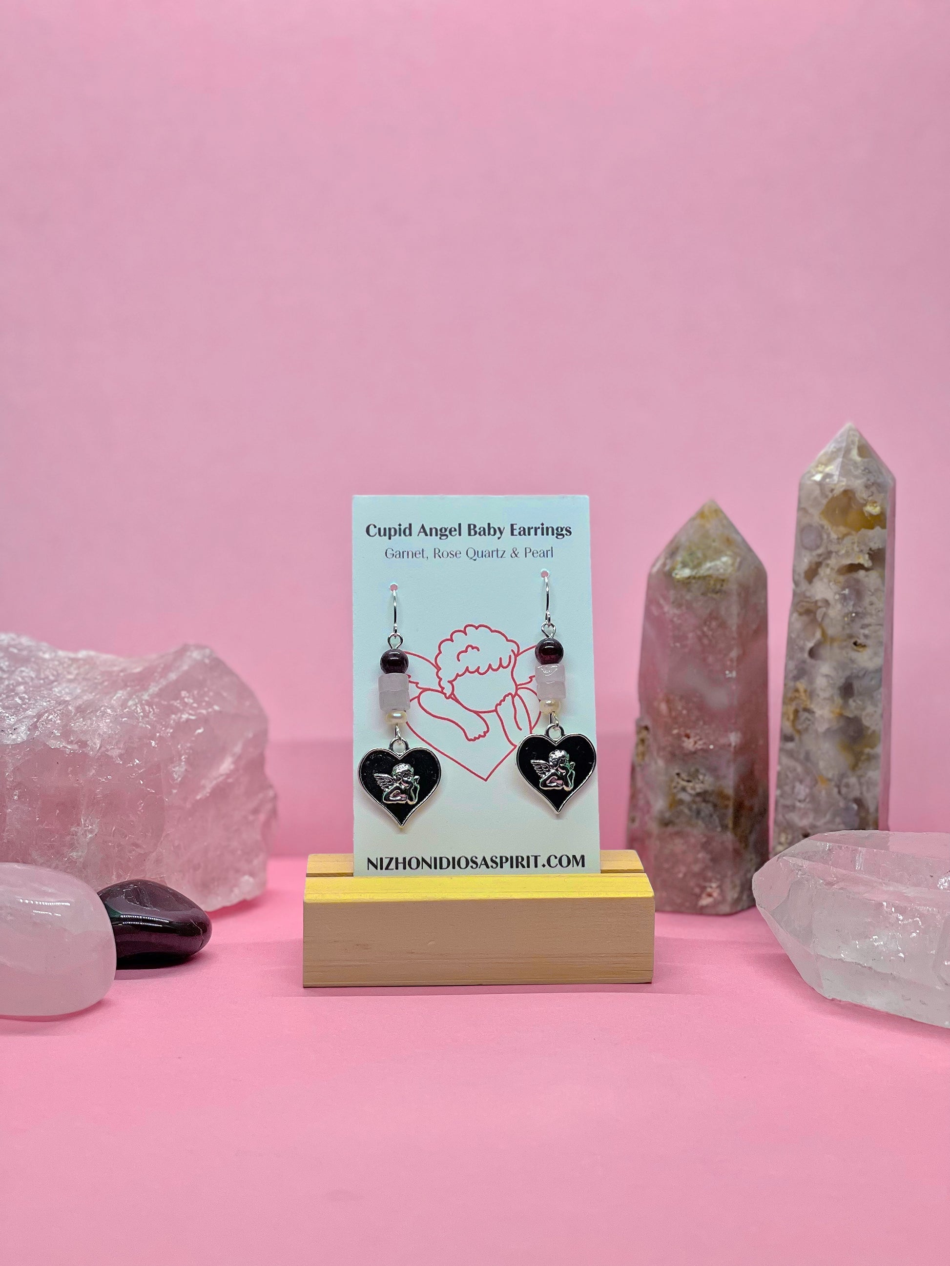 Delicately crafted with the love of rose quartz, the deep passion of garnet, and the gentle luster of a single pearl, these earrings are a tribute to love and innocence. The design evokes the playful spirit of Cupid, with a celestial angelic touch. A harmonious blend of colors and textures, these earrings embody both tenderness and fiery affection, making them a perfect adornment for anyone who carries love in their heart.