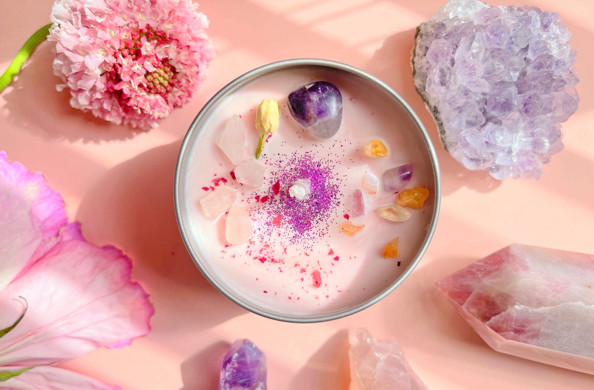 Handcrafted with Organic Soy Wax, infused with Rose Quartz, Amethyst, Ametrine, & Jasmine Flowers. Scented with Cherry Blossom