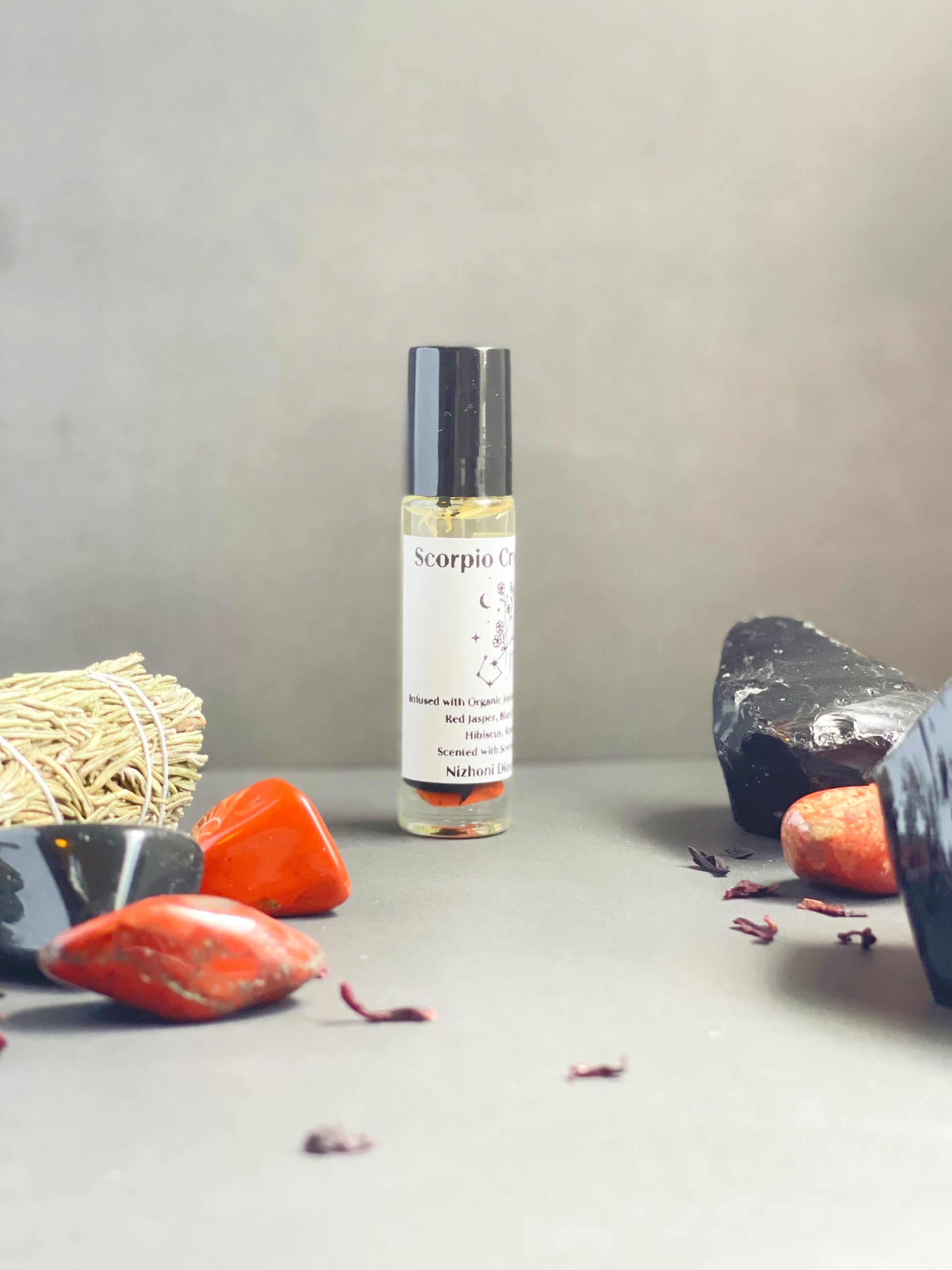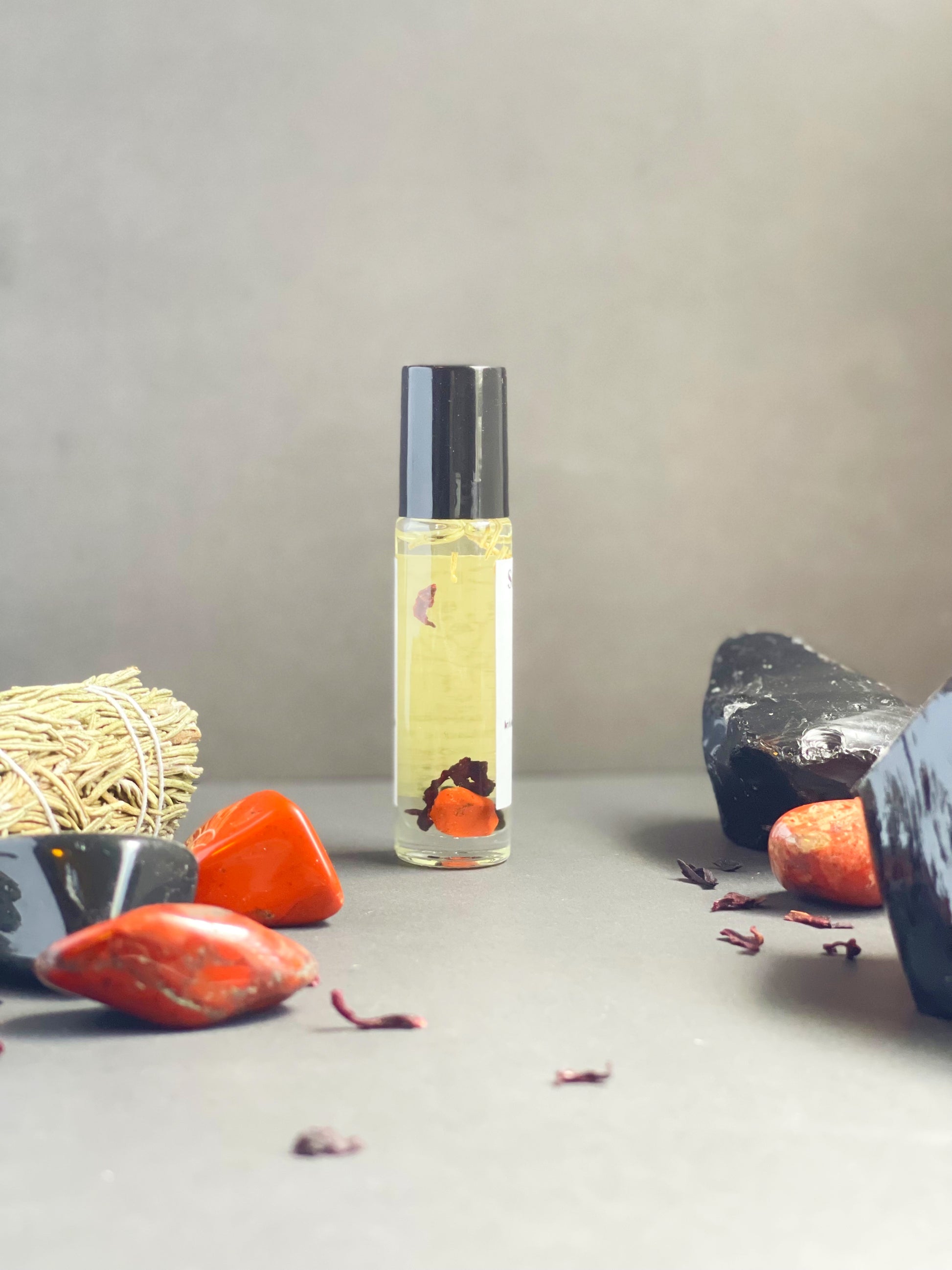 Handcrafted with Organic Jojoba Oil & Sweet Almond Oil, infused with Red Jasper, Black Obsidian, Hibiscus & Rosemary. Scented with Smoked Incense