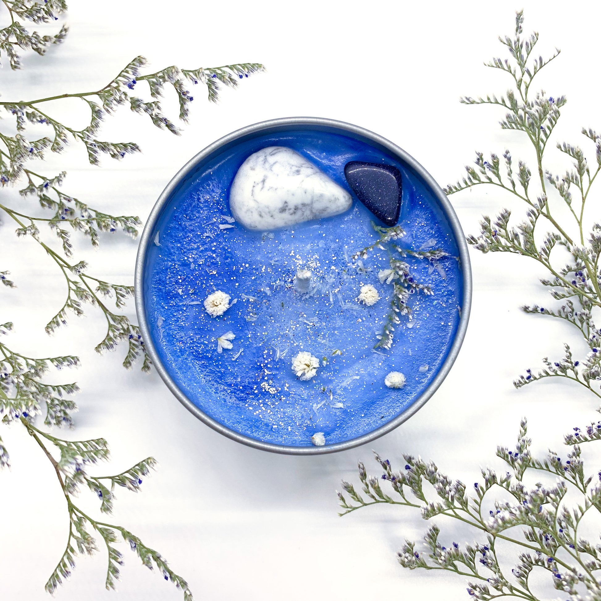 Infused with White Howlite a highly powerful calming stone, calms emotions, very supportive when having trouble sleeping. White Howlite is a companion & supports with patience, anger, anxiety, stress & intense emotions. Paired with Blue Goldstone, uplifting ones spirit, encouraging vitality and comfort, compassion & deep care. Scented with Blue Spruce